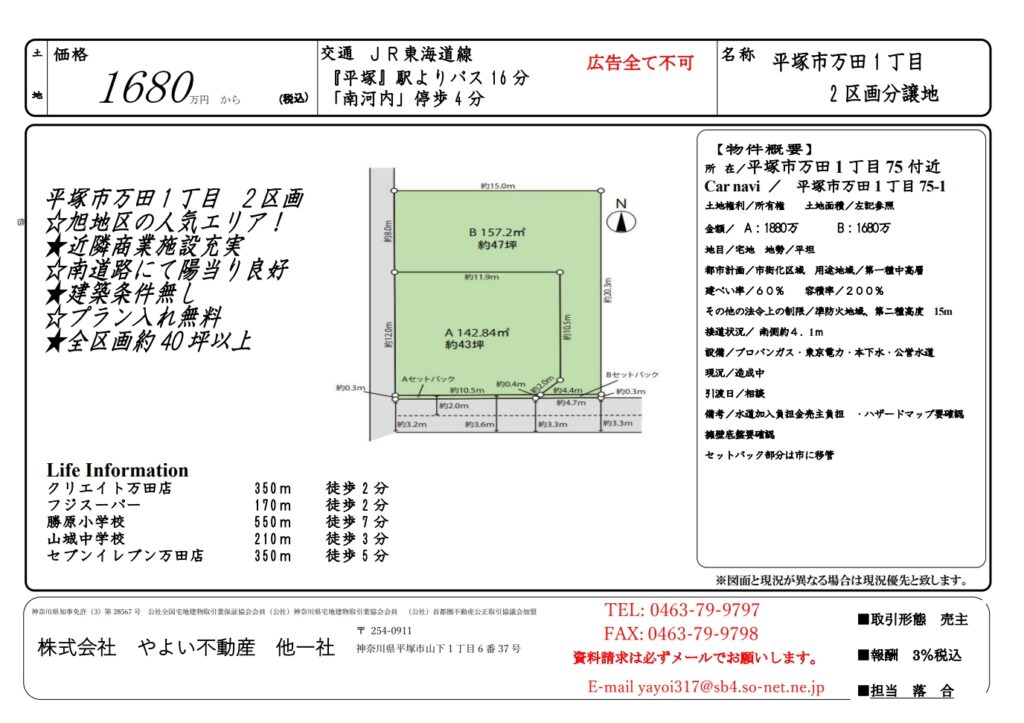平塚市万田1丁目 建築条件無し 売地